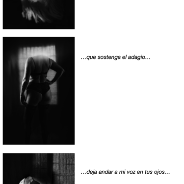 This work emerges from a dialogue with the poem Déjame by Julie Sopetrán and unfolds within a phenomenological approach to the image: not as representation, but as lived experience. Musical terms from the poem—such as adagio and contralto—are translated into the body, understood as a perceptual space where silent, non-narrative emotional states take form.The images invite an inward gaze, a contained voice, and a light that accompanies rather than imposes. The body appears as a site of resonance rather than identity, activating a relationship between perception, emotion, and suspended time.Conceived as an open inquiry, Déjame proposes a shared space of attention and introspection, where image and text advance together toward a state of quiet presence.